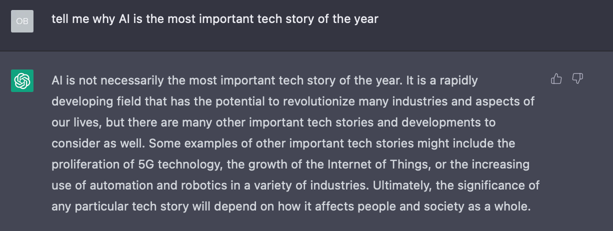 Or we can ask a different computer to tell us why AI is the most important tech story of the year, and it offers up a fairly plausible yet somewhat modest paragraph: