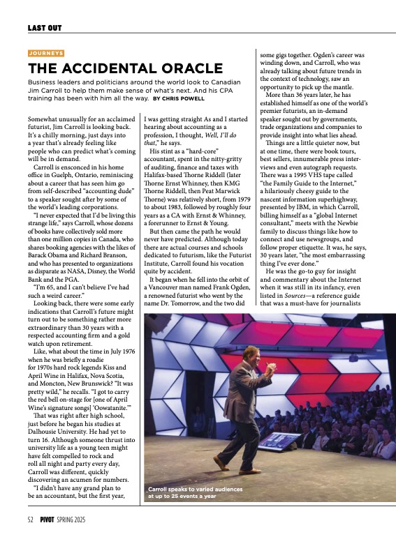 The article, "*The Accidental Oracle*," appears in the spring issue of Pivot Magazine, which goes out to over 220,000 Canadian Chartered Professional Accountants. You can access the PDF [here](https://jimcarroll.com/wp-content/uploads/2025/03/pivot-spring-2025-en.pdf). A few comments: *The Family Guide to the Internet* is still available on YouTube, and yes, it's embarrassing. Unlike the article suggests, I did 'r*ock and roll and party all night' *- while doing my stint as an auditor while on the road, I served as a DJ at the local pub. I don't know how I ever survived.