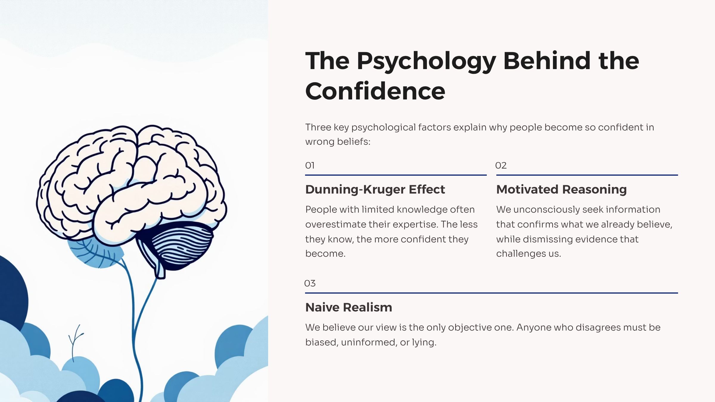 - **Motivated Reasoning**: We have an unconscious tendency to seek out information that confirms our existing beliefs. At the same time, we dismiss evidence that challenges those beliefs.