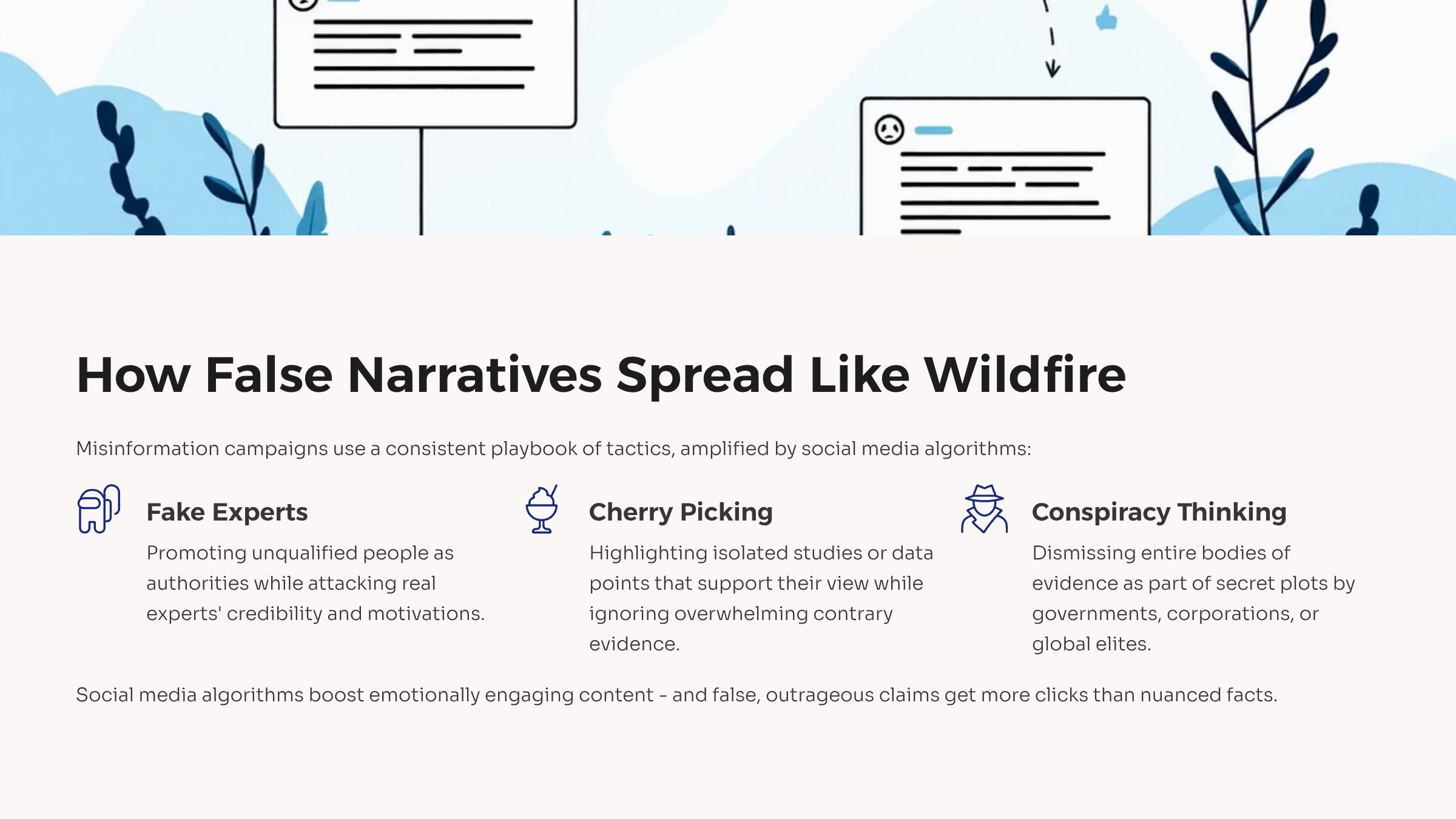 *We also all know that these false narratives now spread like wildfire. The people who share their 'expertise'* have mastered the art of the illogical, using a consistent set of tactics, which are then amplified by social media algorithms. These tactics include: