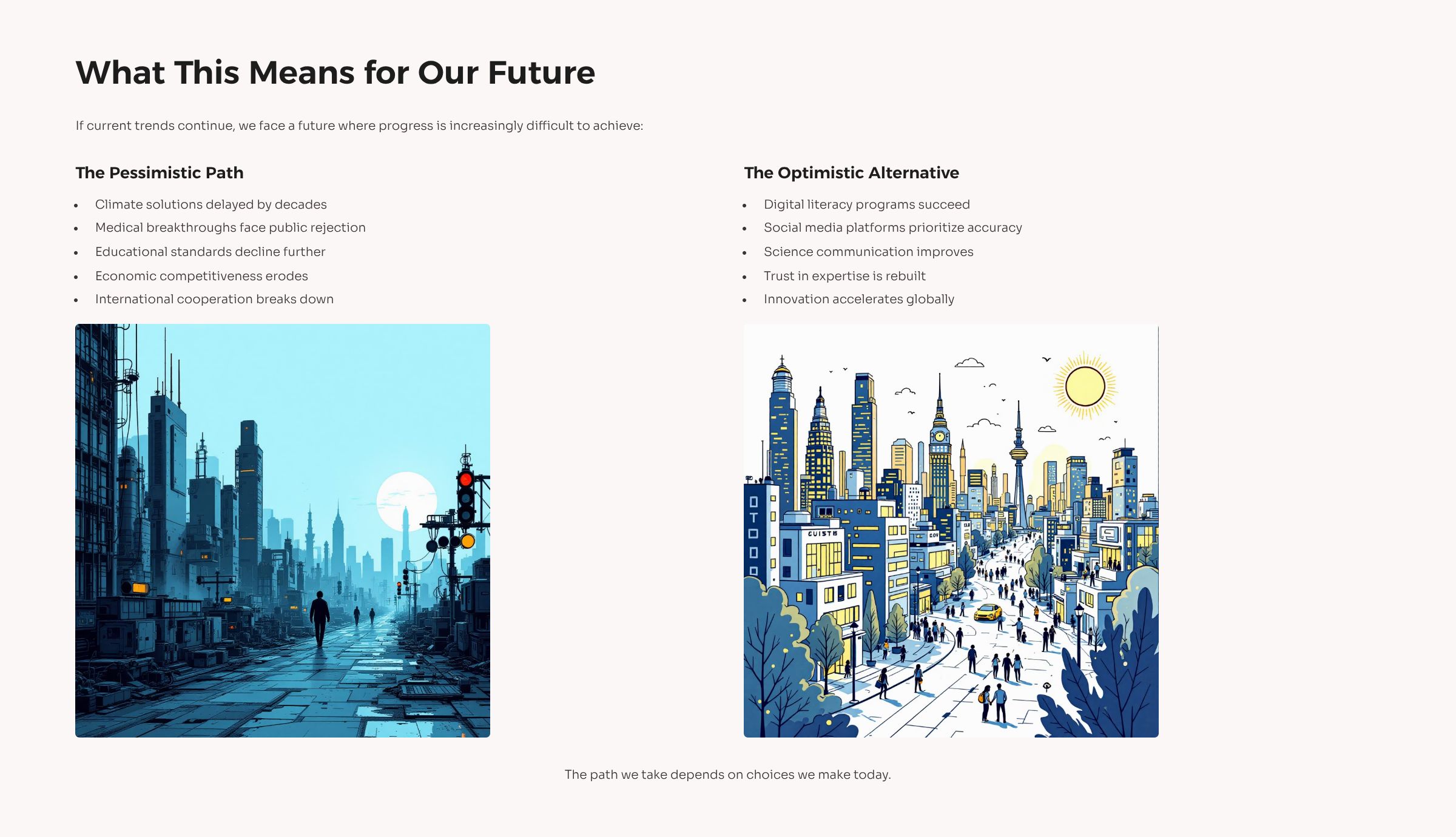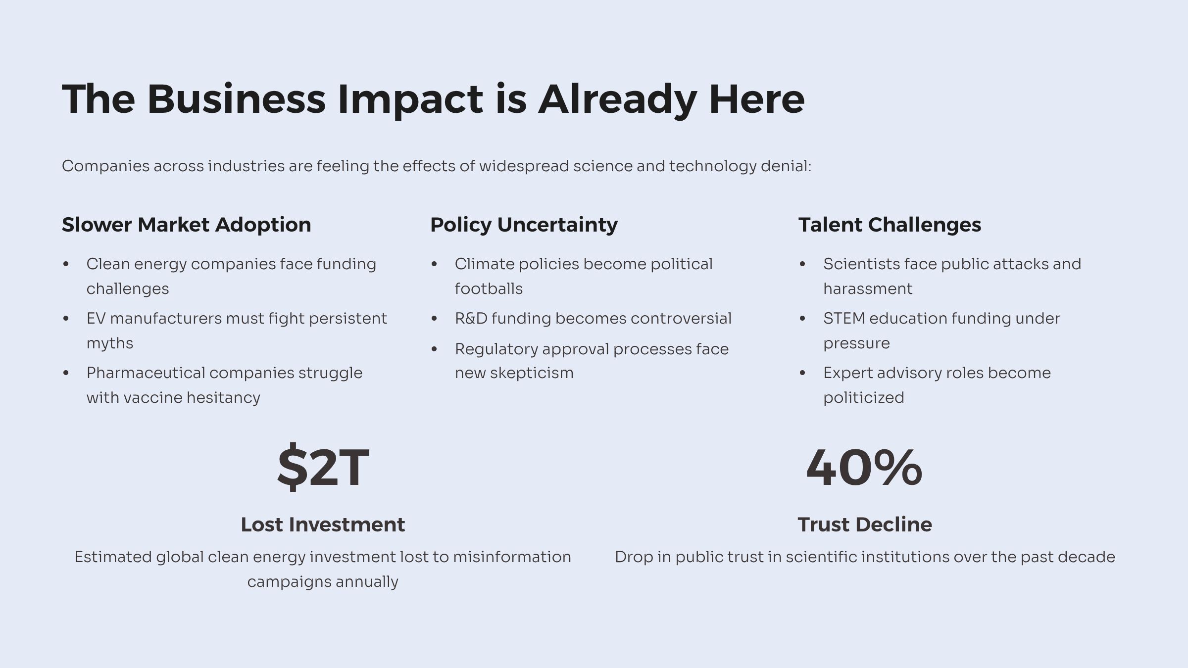 Think about it: companies in many industries are feeling the effects of widespread denial of science and technology. The public trust in scientific institutions has seen a 40% drop over the last decade. People have come to accept the idea that going back is better than going forward. This has led to several challenges: