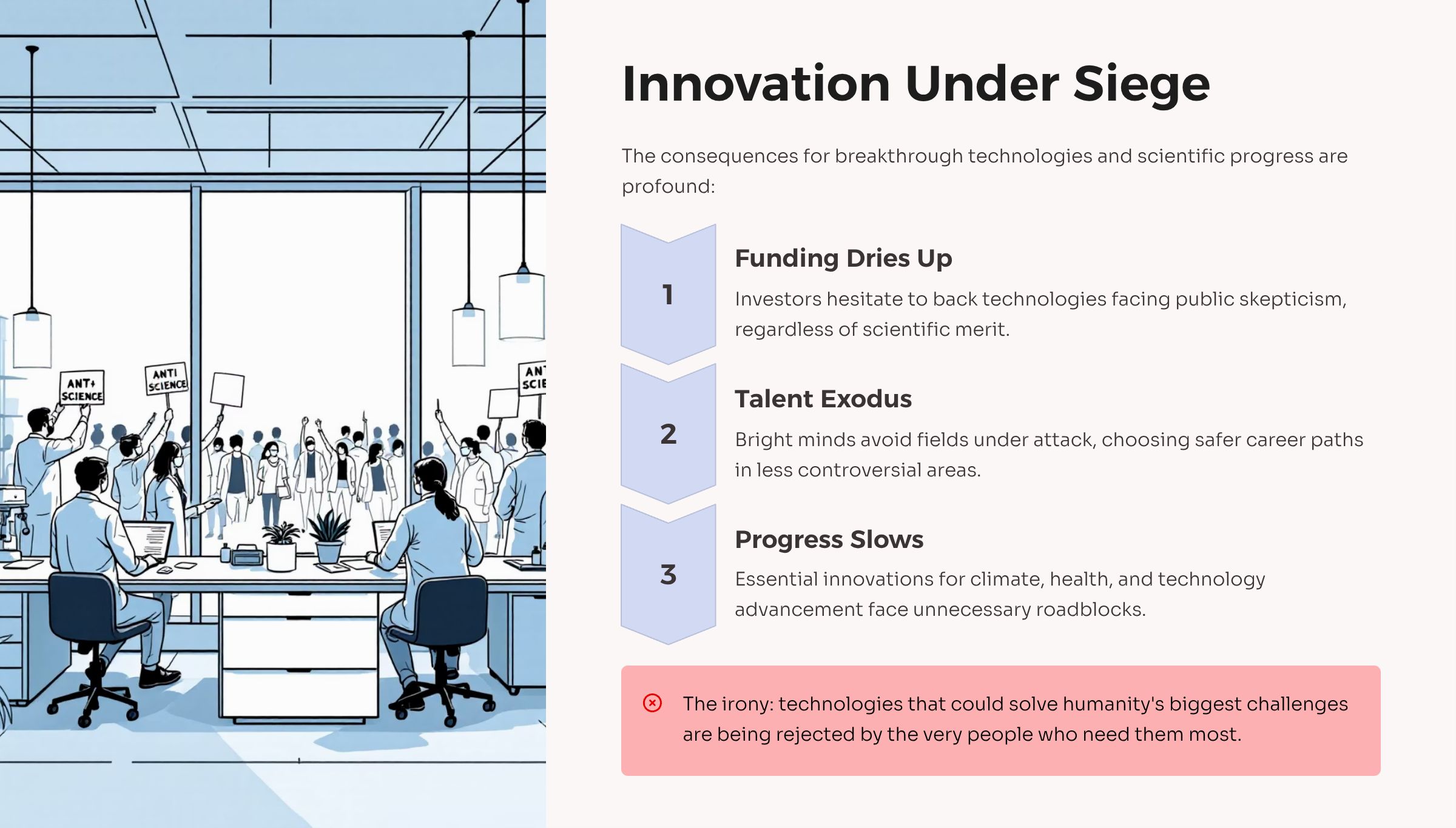 - **funding dries up:** Investors are hesitant to support technologies that face public skepticism, even if their scientific merit is sound.