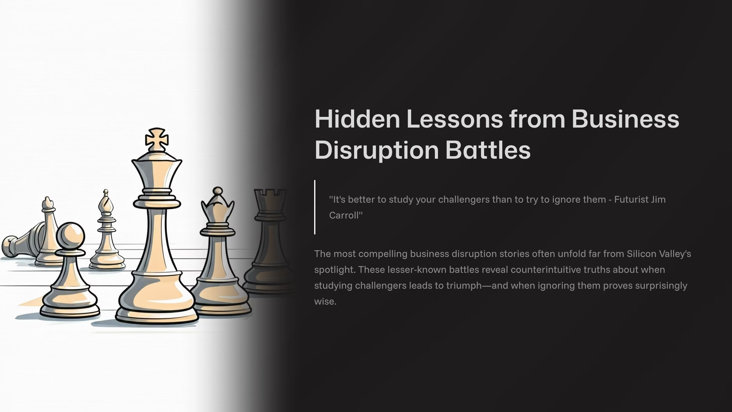 With that idea in mind, turn that weakness into a strength. I decided that for this particular situation, I wanted to build a section into the outline that would cover "*hidden lessons from business disruption battles*," going beyond the typical Silicon Valley business model disruption stories that get into this type of idea. The fact is, some of the most compelling business-disruption stories often unfold far from Silicon Valley's spotlight - and provide some very valuable lessons.