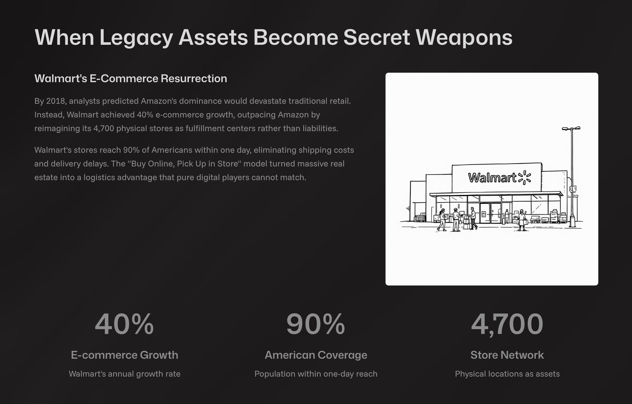 By 2018, analysts predicted Amazon's dominance would devastate traditional retail. Instead, Walmart achieved 40% e-commerce growth, outpacing Amazon by reimagining its 4,700 physical stores as fulfillment centers rather than liabilities. Walmart's stores reach 90% of Americans within one day, eliminating shipping costs and delivery delays. The "*Buy Online, Pick Up in Store*" model they put in place turned massive real estate into a logistics advantage that pure digital players cannot match.