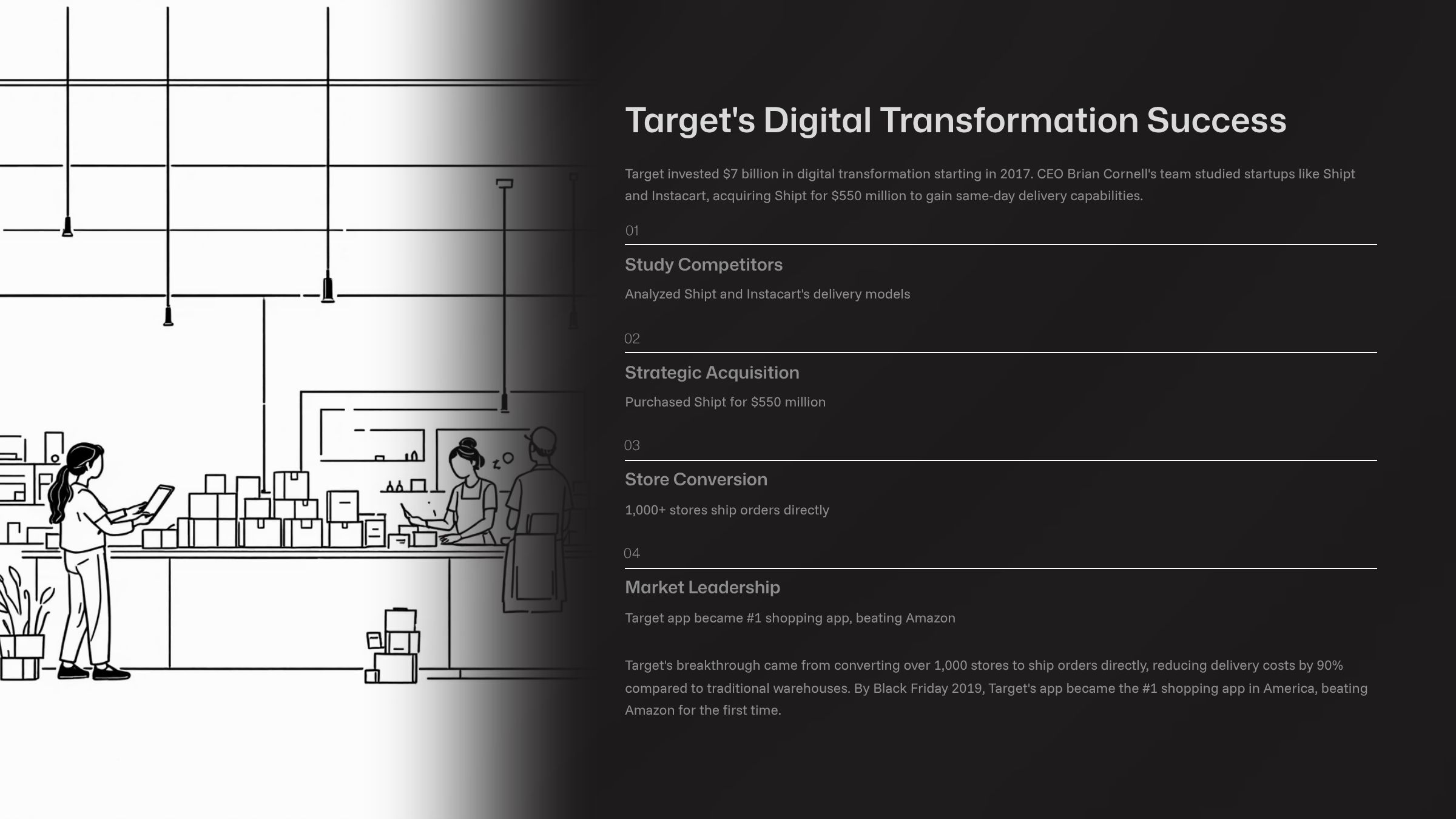 Or how about Target's digital transformation success? They invested $7 billion in digital transformation starting in 2017. Their team studied startups like Shipt and Instacart, acquiring Shipt for $550 million to gain same-day delivery capabilities.