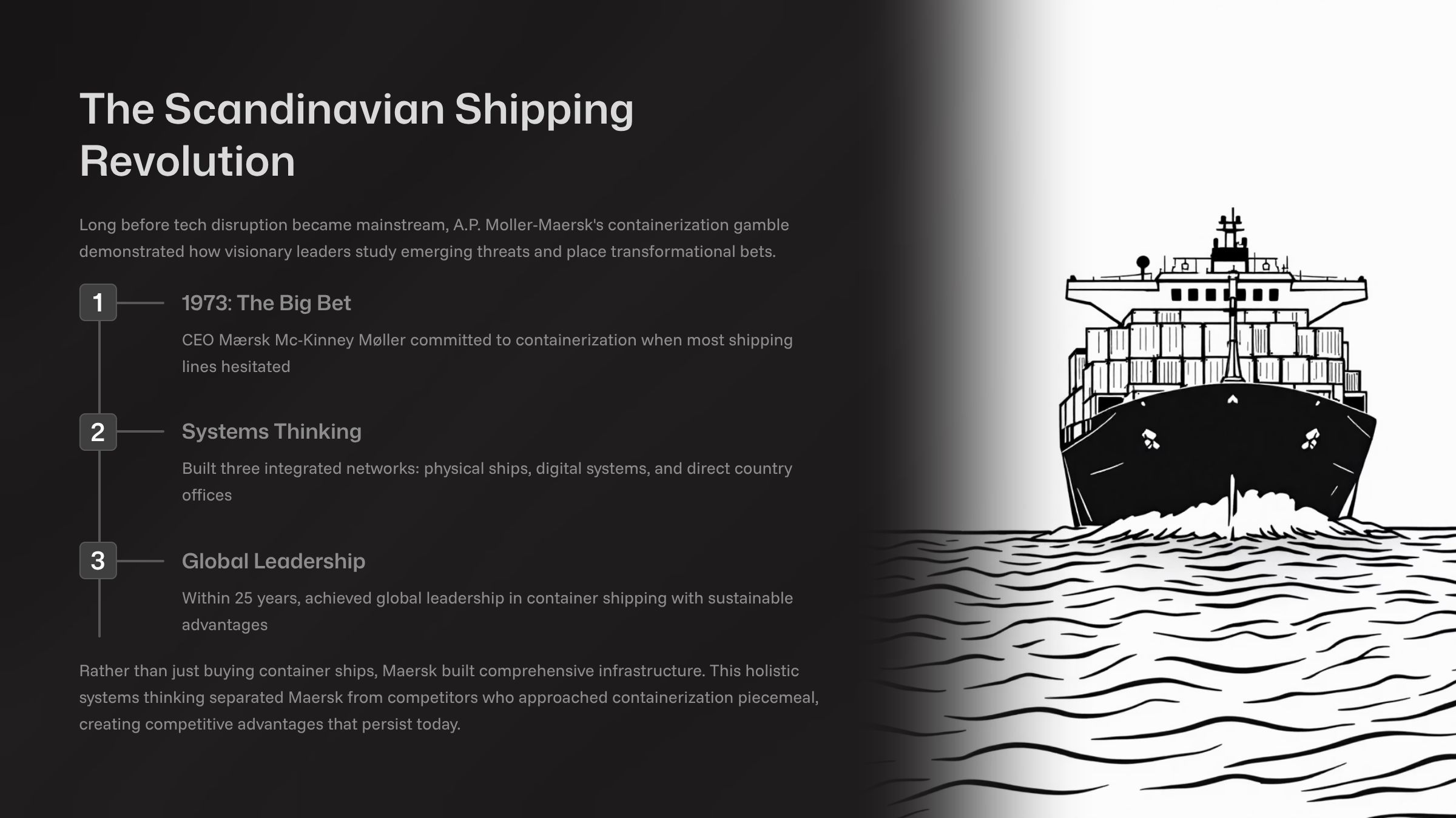 Then there is the Scandinavian shipping revolution. Long before tech disruption became mainstream, A.P. Moller-Maersk's containerization gamble demonstrated how visionary leaders study emerging threats and place transformational bets.