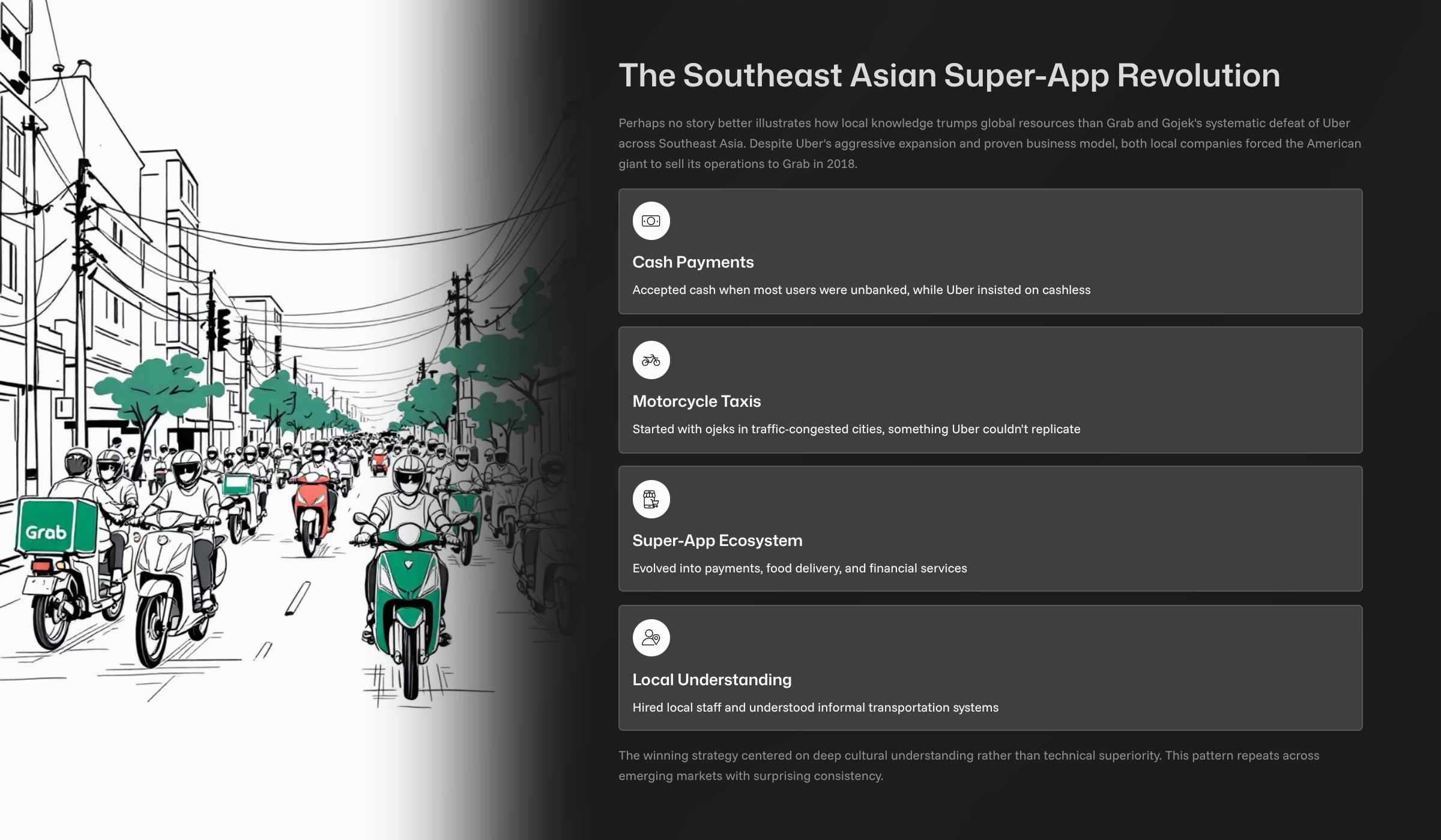 Perhaps no story better illustrates how local knowledge trumps global resources than Grab and Gojek's systematic defeat of Uber across Southeast Asia. Despite Uber's aggressive expansion and proven business model, both local companies forced the American giant to sell its operations to Grab in 2018. The winning strategy centered on deep cultural understanding rather than technical superiority.