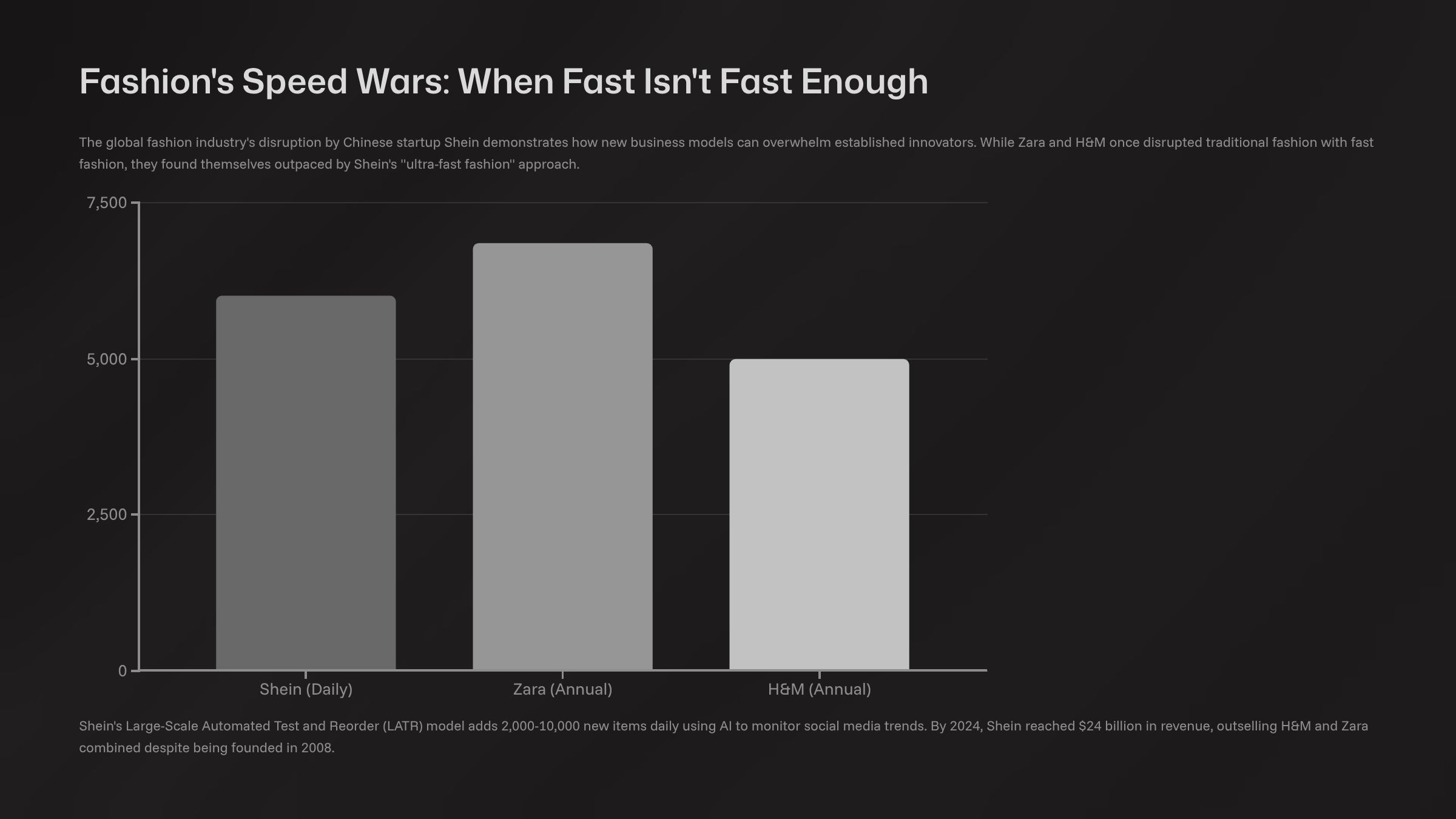 The global fashion industry's disruption by Chinese startup Shein demonstrates how new business models can overwhelm established innovators. While Zara and H&M once disrupted traditional fashion with their *"fast fashion"* model, they found themselves outpaced by Shein's "*ultra-fast fashion"* approach. Do you see an influencer on social media with an outfit you like? Shein probably saw it too and had it ready for sale within hours.