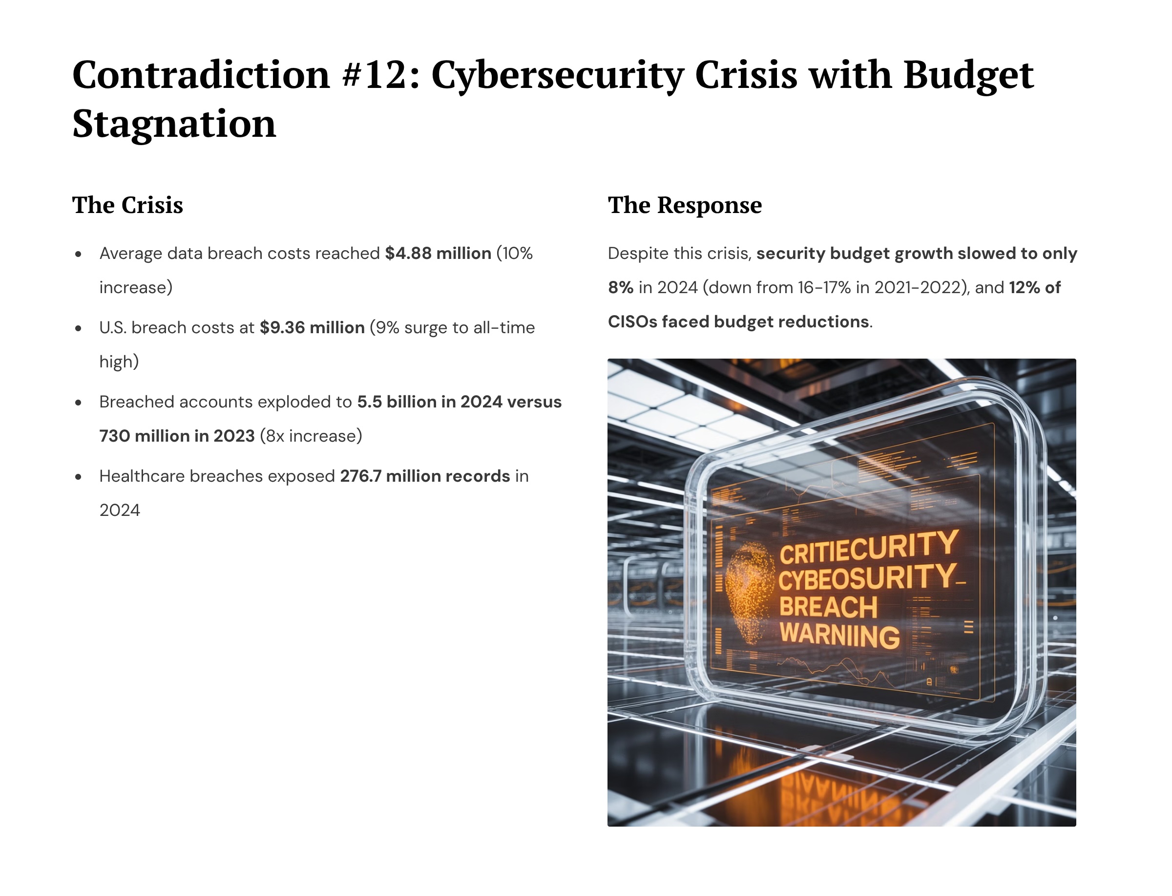 This one gets into actual corporate stories and observations., I ran the PDF through multiple AI systems for a fact check, and it's pretty spot on. Consider the major contradiction between the escalating cybersecurity crisis and the slowing budget growth.