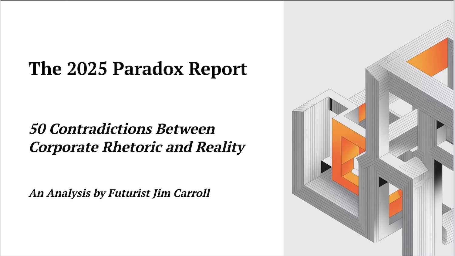The first, "[**The 2025 Paradox Report: *****50 Contradictions Between Corporate Rhetoric and Reality**"*](https://pdf.jimcarroll.com/The-2025-Paradox-Report.pdf), will give you a pretty quick idea of the nature of the gap.