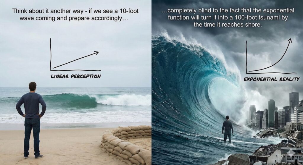 Why? Because you are a human being. We are linearly wired creatures living in an exponential world. Our brains evolved to track linear threats—a lion moving across the savannah at a constant speed. We understand “*1, 2, 3, 4, 5.*” Slow, linear growth.