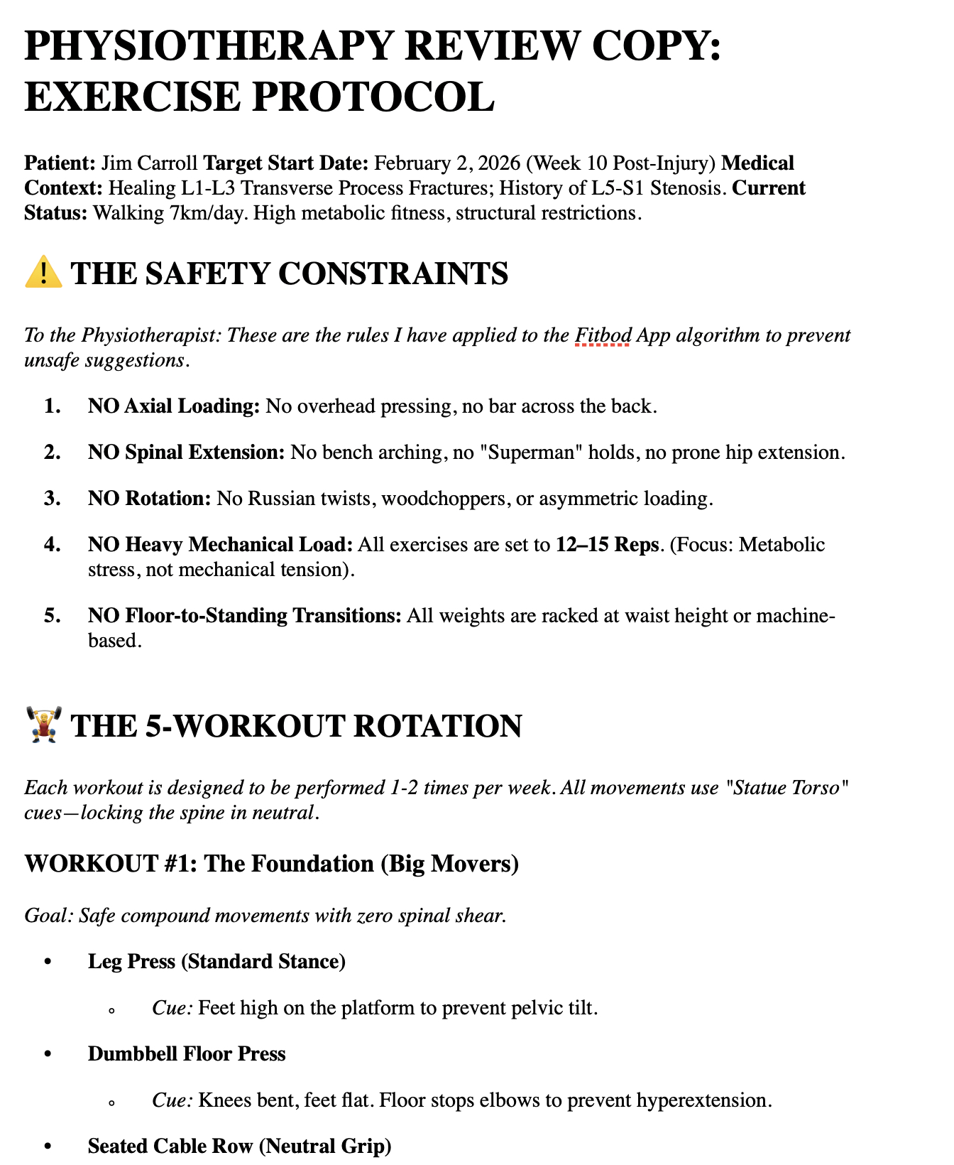 **16. The "Pre-Flight" Gym Protocol**. We created a strict "50% Load" governance model for my return to the gym. The goal was to test the chassis without breaking it.