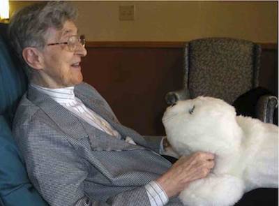 *Aides also take Paro to residents' rooms to get them to socialize. At another Vincentian home, Lois Simmeth, 73, doesn't always participate in group activities, but she ventures into the hall when she hears Paro's sounds.*